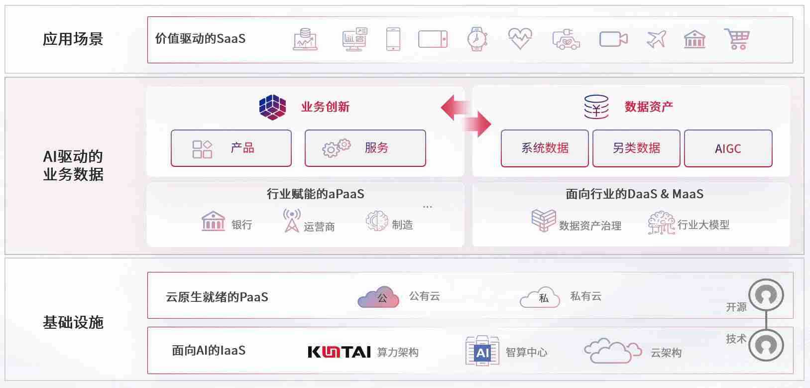 数字时代,,,,围绕企业数字化转型的关键要素,,,AG尊龙凯时数码开创性的提出数云融合战略和技术体系框架,,,着力在云原生、、数字原生、、、AI原生和信创产业上架构产品和服务能力,,,,为处在不同数字化转型阶段的快消零售、、汽车、、金融、、、医疗、、、政企、、、、教育、、、、运营商等行业客户提供泛在的敏捷IT能力和融合的数据驱动能力,,构建跨界融合创新的数字业务场景和新业务模式,,助力企业级客户建立面向未来的核心能力和竞争优势,,,,全面推动社会的数字化、、、、智能化转型升级。。。